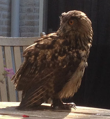 De oehoe nam bezit van de tuintafel. Het hondje van de mensen werd snel naar binnen geloodst....